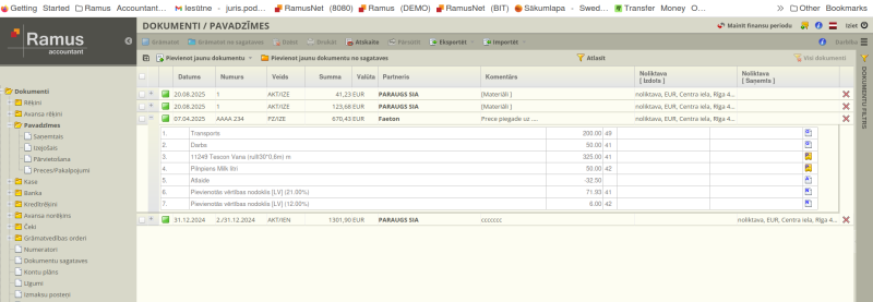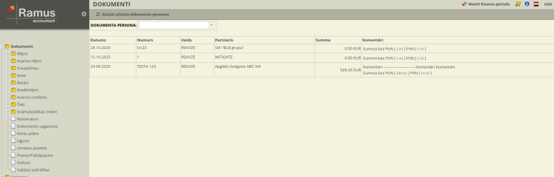 - Pārskatāmība: Reģistrā redzami dokumentu numuri, datumi, partneri un kopējās summas.