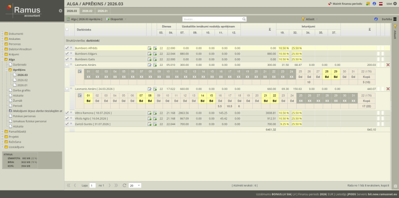 - Detaļas: Atverot konkrēta darbinieka aprēķinu, redzamas visas komponentes: neapliekamais minimums, atvieglojumi par apgādājamajiem u.c..